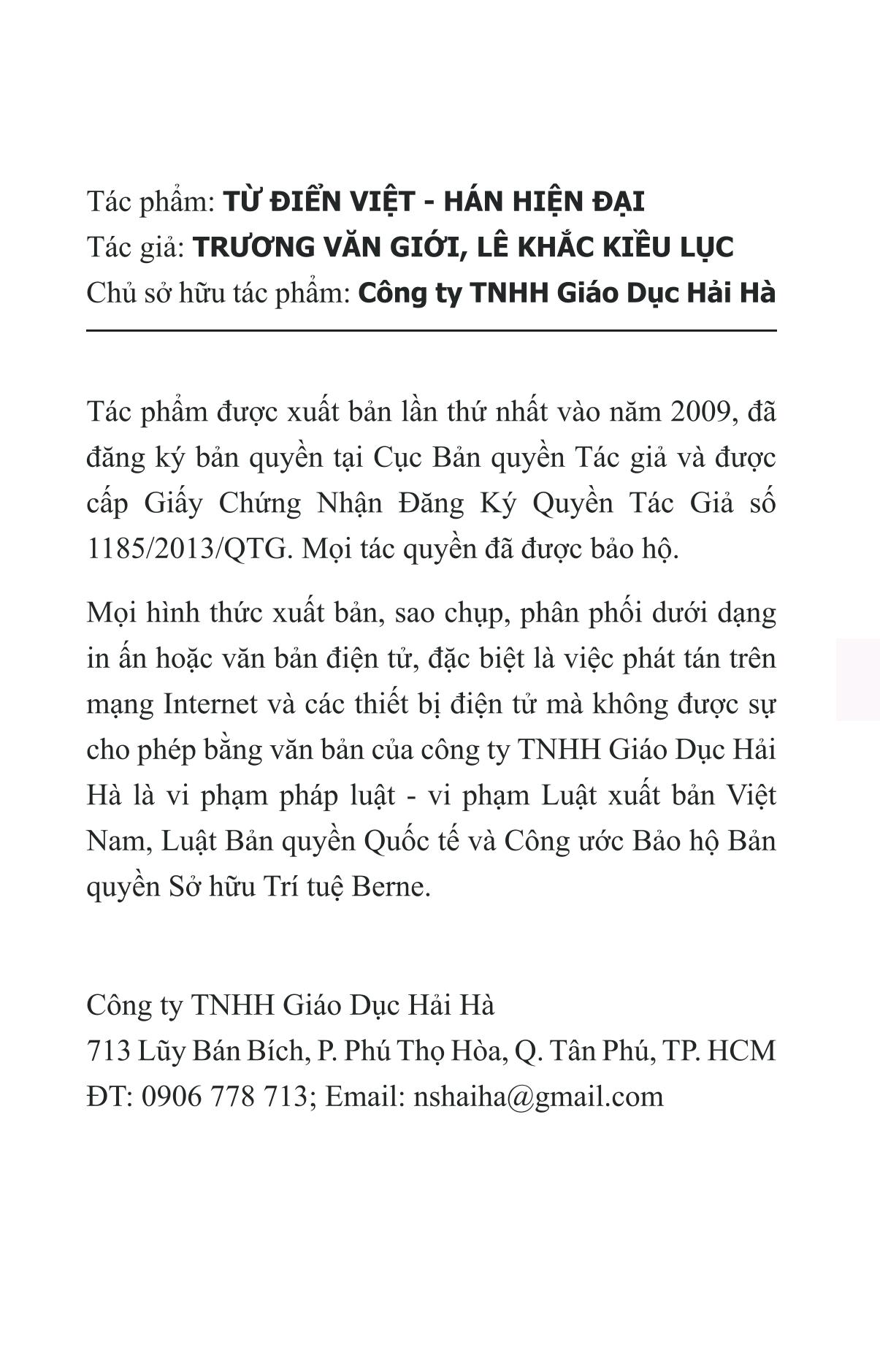 Sách: Từ Điển Hán Việt Hiện Đại Tác giả: Đỗ Văn Nhân (Chủ biên) - Hồ Ngọc Dung Nhà phát hành: Trung Tâm Kinh Doanh Xuất Bản Và Phát Hành Sách Nhà xuất bản: NXB