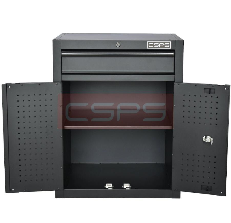 Tủ dụng cụ CSPS 61cm - 01 hộc kéo màu đỏ ván gỗ vách lưới 1.THÔNG SỐ CHUNG Kích thước đóng gói/ Package dimension: 62cm W x 43cm D x 78.5cm H Kích thước sản