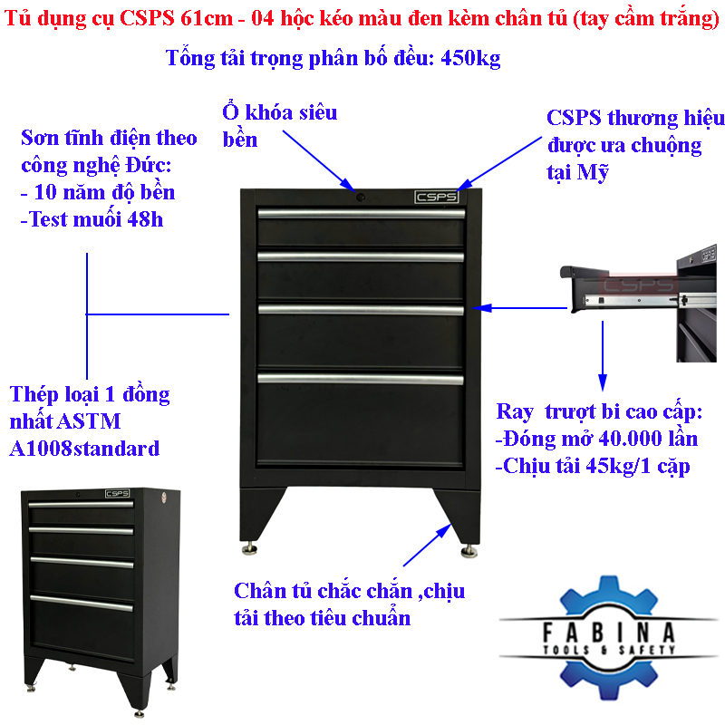 Tủ dụng cụ CSPS 61cm - 04 hộc kéo màu đen kèm chân tủ (tay cầm trắng)