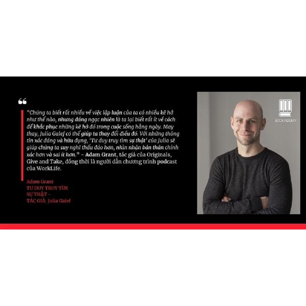 “Chúng ta biết rất nhiều về việc lập luận của ta có nhiều kẽ hở như thế nào, nhưng đáng ngạc nhiên là ta lại biết rất ít về cách để khắc phục những kẽ hở đó trong cuộc sống hằng ngày. May thay, Julia Galef có thể giúp ta thay đổi điều đó. Với những thông tin xác đáng và hữu dụng, ‘Tư duy truy tìm sự thật’ của Julia sẽ giúp chúng ta suy nghĩ thấu đáo hơn, nhìn nhận bản thân chính xác hơn và sai ít hơn.” - Adam Grant, tác giả của Originals, Give and Take, đồng thời là người dẫn chương trình podcast của WorkLife.