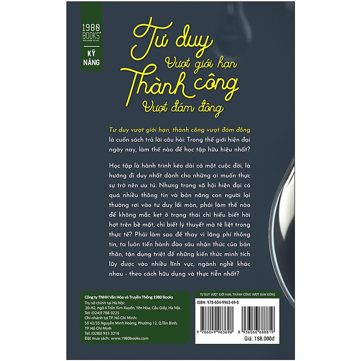 Trong thế giới hiện đại ngày nay, làm thế nào để học tập hữu hiệu nhất? Song song với khối lượng tri thức khổng lồ được sản sinh mỗi ngày khiến con người bị nhiễu loạn thông tin, bản thân mỗi cá nhân chúng ta cũng rất dễ hình thành những kiểu suy nghĩ rập khuôn, định kiến, đi vào lối mòn tư duy, làm cản trở quá trình khám phá các hiện tượng, sự vật một cách sâu sắc. Học tập là hành trình kéo dài cả một cuộc đời, là hướng đi duy nhất dành cho những ai muốn thực sự trở nên ưu tú. “Tư duy vượt giới hạn, thành công vượt đám đông” là cuốn sách trả lời câu hỏi đó. Vậy làm thế nào để không mắc kẹt ở trạng thái hiểu biết hời hợt trên bề mặt, biết rộng mà chẳng biết sâu, chỉ biết lý thuyết mà tê liệt trong thực tế? Phải làm sao để thay vì lãng phí thông tin, ta luôn tiến hành đào sâu nhận thức của bản thân đối với mỗi vấn đề, tận dụng triệt để những kiến thức mình tích lũy được vào nhiều lĩnh vực, ngành nghề khác nhau - theo cách hữu dụng và thực tiễn nhất? Chuyên gia nghiên cứu về phương pháp tư duy và học tập - tác giả Thái Đồng - đã viết “Tư duy vượt giới hạn, thành công vượt đám đông” để trình bày kỹ lưỡng các phương pháp học tập chuyên sâu, đem lại nhiều giải pháp đặc biệt hữu ích cho tất cả những ai mong muốn nâng cao hiểu biết và kỹ năng của mình lên các nấc thang mới. Càng trưởng thành, ta càng khó phát triển kiến thức vì những nguyên do chủ quan lẫn khách quan. Nhưng nếu như được cung cấp đúng công cụ và bắt tay vào thay đổi nhận thức, nhìn thế giới theo các góc độ mới cũng như nghiêm túc học hỏi theo từng bước, thì bất cứ ai cũng có thể ngày một trở nên sâu sắc, tinh tế hơn, trở thành một phiên bản tốt hơn của chính mình. “Tư duy vượt giới hạn, thành công vượt đám đông” có tám chương sách, tương ứng với hệ thống tư duy cao cấp gồm tám góc độ, giúp độc giả xác định phương hướng để giải quyết các vấn đề mình gặp phải trong cuộc sống: Để tạo dựng nên hệ thống tư duy và các khung làm việc hữu ích cho độc giả, tác giả Thái Đồng đã sử dụng rất nhiều ví dụ thực tiễn và gần gũi trong cuộc sống, thuộc nhiều ngành nghề, lĩnh vực khác nhau. Từ những thứ thân thuộc như cây bút chì, cách nấu ăn, đến những điều phức tạp hơn như hệ thống chia sẻ xe, dây chuyền sản xuất tinh gọn…vô số câu chuyện đời thường đã được dùng để minh họa cho các phương pháp tư duy, không những khiến cuốn sách trở nên sinh động hơn, mà còn giúp người đọc thực sự hiểu quá trình rèn luyện suy nghĩ và nâng cao năng lực thực tế cần diễn ra như thế nào. Học hỏi kinh nghiệm từ những người đi trước, ứng dụng linh hoạt với hoàn cảnh của bản thân mình, nghiêm túc và kiên trì đi theo con đường đúng đắn - nếu như bạn muốn ngày một trở nên ưu tú, không bao giờ là quá muộn.
