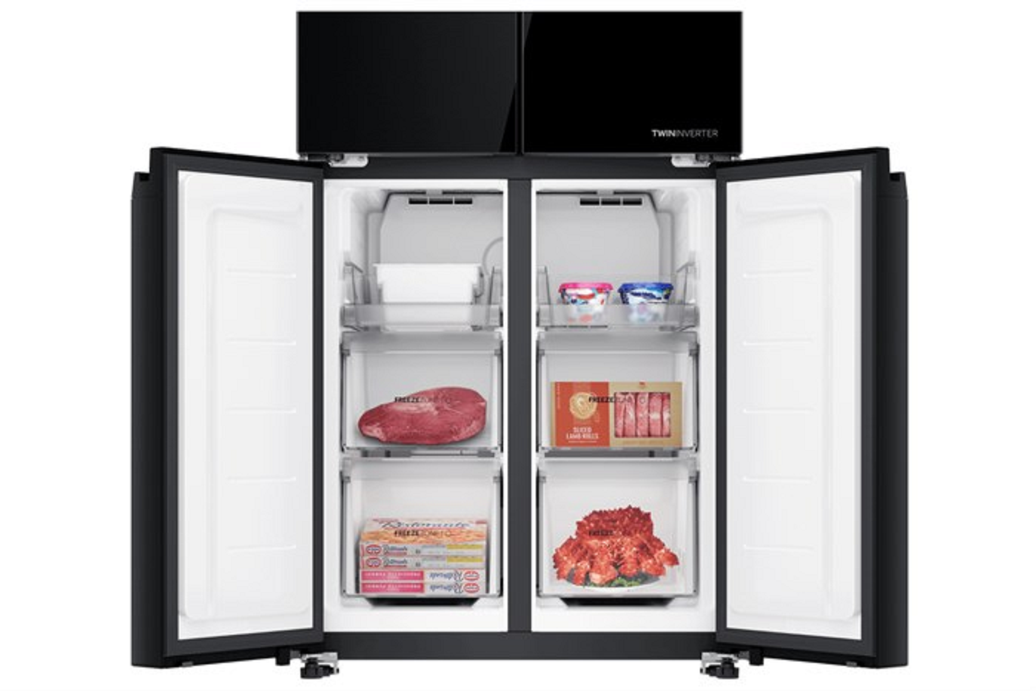 • Dung tích ngăn đá 146 lít với thiết kế độc đáo chia làm 2 ngăn đông riêng biệt, bạn có thể sắp xếp, phân loại các mặt hàng đông lạnh một cách dễ dàng, tránh tình trạng lẫn mùi và làm mất độ tươi ngon của thực phẩm.     Công nghệ tiết kiệm điện - Công nghệ Twin Inverter là sự kết hợp của máy nén và quạt gió Inverter, giúp tủ hoạt động êm ái, tiết kiệm điện năng. Công nghệ Inverter còn cho tủ khả năng làm lạnh nhanh chóng và duy trì nhiệt độ phù hợp giúp tủ không gặp phải tình trạng đóng tuyết.   Công nghệ làm lạnh + Công nghệ bảo quản thực phẩm - Công nghệ làm lạnh đa chiều giúp đưa luồng khí lạnh thổi nhanh và đều tới mọi ngóc ngách của các ngăn chứa trong tủ lạnh, không chỉ tăng cường khả năng bảo quản thực phẩm mà còn giúp làm lạnh nhanh chóng. Bạn có thể thưởng thức trái cây tươi mát hoặc những ly nước lạnh tức thì trong những ngày hè oi bức.