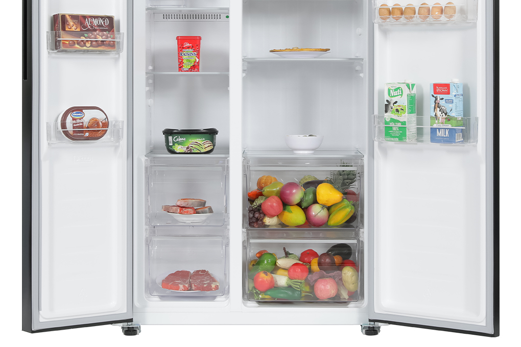 THÔNG TIN SẢN PHẨM - Kiểu tủ:Tủ lớn - Side by Side - 2 cánh - Dung tích sử dụng:519 lít - 4 - 5 người - Dung tích tổng:Hãng không công bố - Dung tích ngăn đá:185 lít - Dung tích ngăn lạnh:334 lít - Chất liệu cửa tủ lạnh:Mặt gương mờ - Chất liệu khay ngăn lạnh:Kính cường lực - Chất liệu ống dẫn gas, dàn lạnh:Ống dẫn gas bằng Đồng - Lá tản nhiệt bằng Nhôm - Năm ra mắt:2023 - Sản xuất tại:Trung Quốc Mức tiêu thụ điện năng - Công suất tiêu thụ công bố theo TCVN:520 kWh/năm - Công nghệ tiết kiệm điện:Inverter Công nghệ bảo quản và làm lạnh - Công nghệ làm lạnh:Luồng khí lạnh đa chiều Multi Air FlowCông nghệ 2 dàn lạnh độc lậpCông nghệ làm lạnh No Frost - Công nghệ bảo quản thực phẩm:Ngăn Moisture Fresh Crisper cân bằng độ ẩm - Công nghệ kháng khuẩn, khử mùi:Bộ lọc Anti Bacteria·Purify diệt khuẩn, khử mùi Tiện ích -