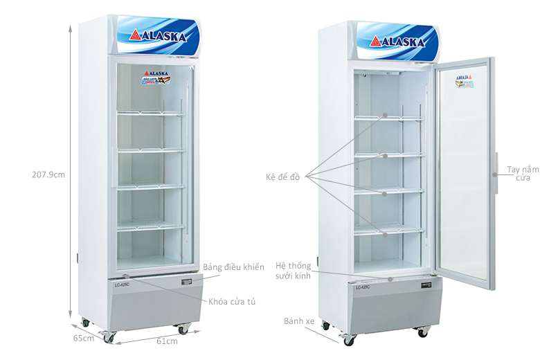 Tủ mát 1 cánh Alaska LC-425C dung tích 425L Tủ mát Alaska LC-425C là chiếc tủ mát siêu thị có dung tích nhỏ nhất trong số model tủ mát 1 cánh kính của hãng Alaska Việt Nam. Với dung tích nhỏ gọn chỉ 425 lít nhưng sản phẩm vẫn được thiết kế đầy đủ các tính năng bảo quản và trưng bày thực phẩm. Tủ mát LC-425C phù hợp với các quán ăn, quán nước, căng tin cỡ nhỏ, siêu thị. Đặc điểm nổi bật của tủ mát Alaska LC-425C