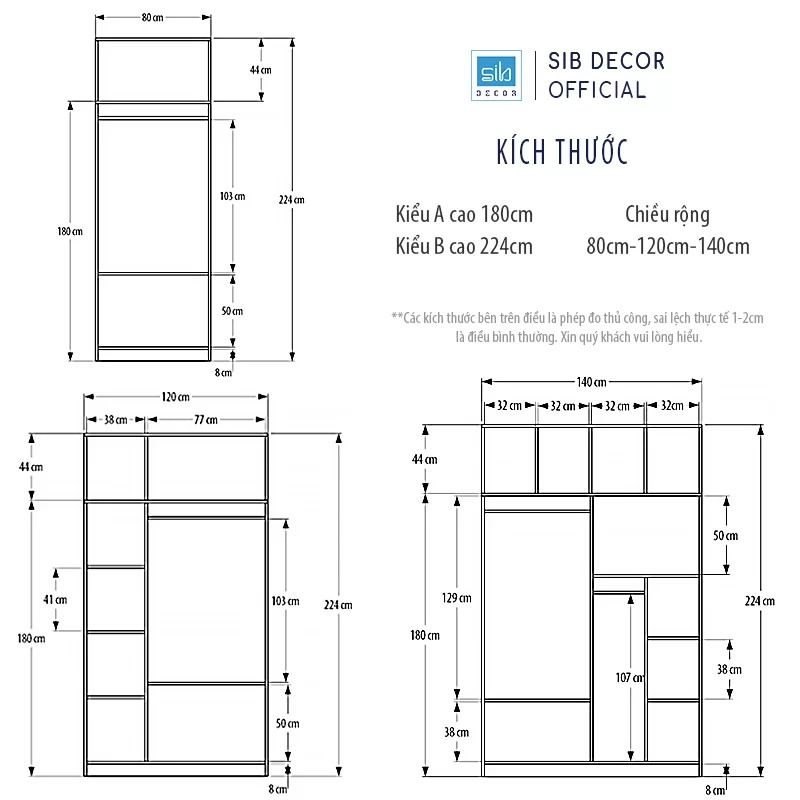 - Thương hiệu: SIB Decor. *Lưu ý: Sản phẩm không bao gồm các vật dụng trang trí. Tủ áo cao 180cm Tủ áo cao 224cm (thêm ngăn tủ bên trên). — — — — — — — — — Điểm nổi bật