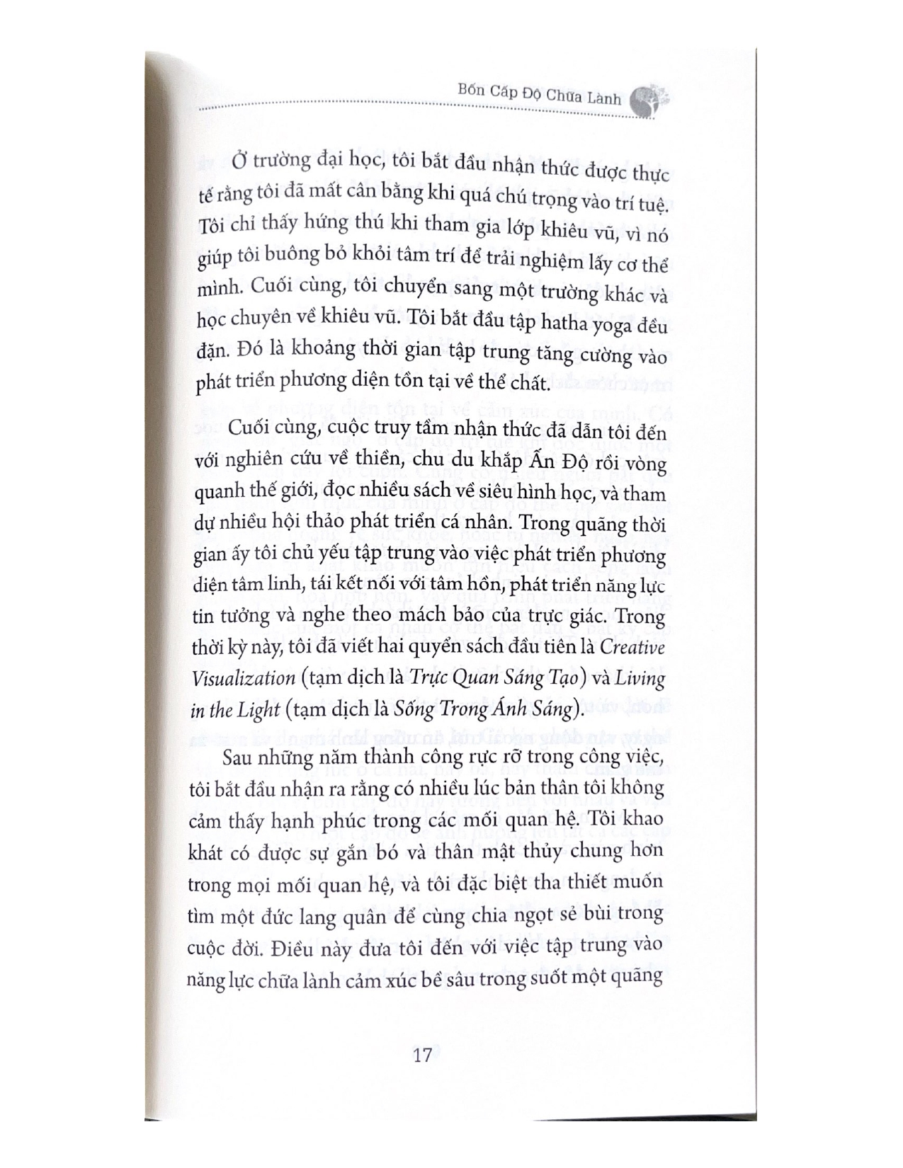 Trong cuốn sách này, Shakti Gawain phát biểu rằng, con người là một tổng thể gồm bốn chiều kích: tâm linh, tinh thần, cảm xúc, thể chất; và con người chỉ có thể sống hạnh phúc và viên mãn khi cả bốn khía cạnh này đều được chữa lành, duy trì và cân bằng. Tổn thương có thể tồn tại dưới nhiều hình thức ở mỗi cấp độ, nhưng với các bài hướng dẫn sâu sắc mà chính Gawain đã tự mình trải nghiệm, bạn chắc chắn sẽ tìm được cách chữa lành tốt nhất cho từng cấp độ tồn tại của mình.