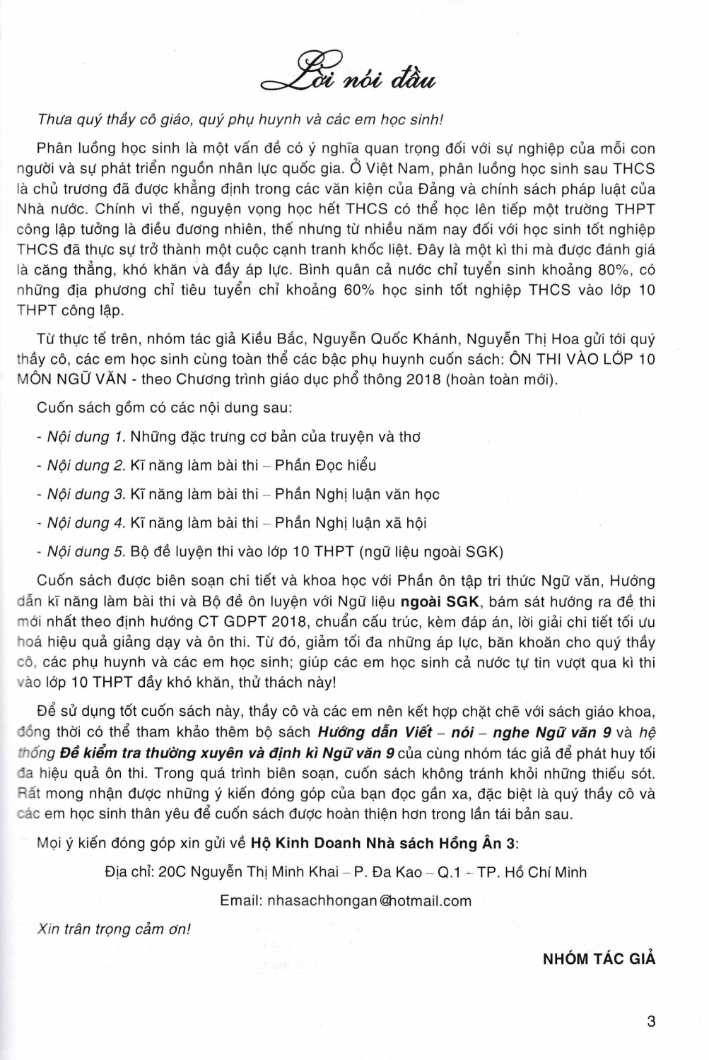 Để sử dụng tốt cuốn sách này, thầy cô và các em nên kết hợp chặt chẽ với sách giáo khoa, đồng thời có thể tham khảo thêm bộ sách Hướng dẫn Viết – nói – nghe Ngữ văn 9 và hệ thống Đề kiểm tra thường xuyên và định kì Ngữ văn 9 của cùng nhóm tác giả để phát huy tối đa hiệu quả ôn thi. Trong quá trình biên soạn, cuốn sách không tránh khỏi những thiếu sót. Rất mong nhận được những ý kiến đóng góp của bạn đọc gần xa, đặc biệt là quý thầy cô và các em học sinh thân yêu để cuốn sách được hoàn thiện hơn trong lần tái bản sau.