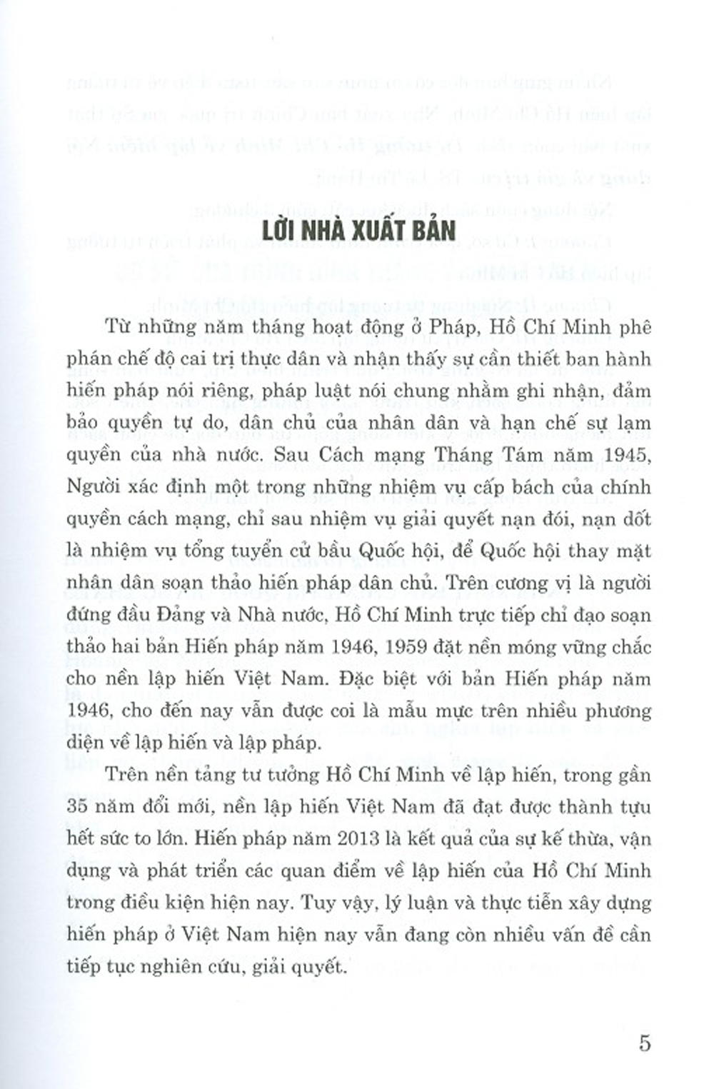 Cuốn sách còn giúp bạn đọc có cái nhìn sâu sắc, toàn diện về tư tưởng lập hiến Hồ Chí Minh. Hiến pháp 2013 là kết quả của sự kế thừa, vận dụng và phát triển các quan điểm về lập hiến của Hồ Chí Minh trong điều kiện hiện nay.
