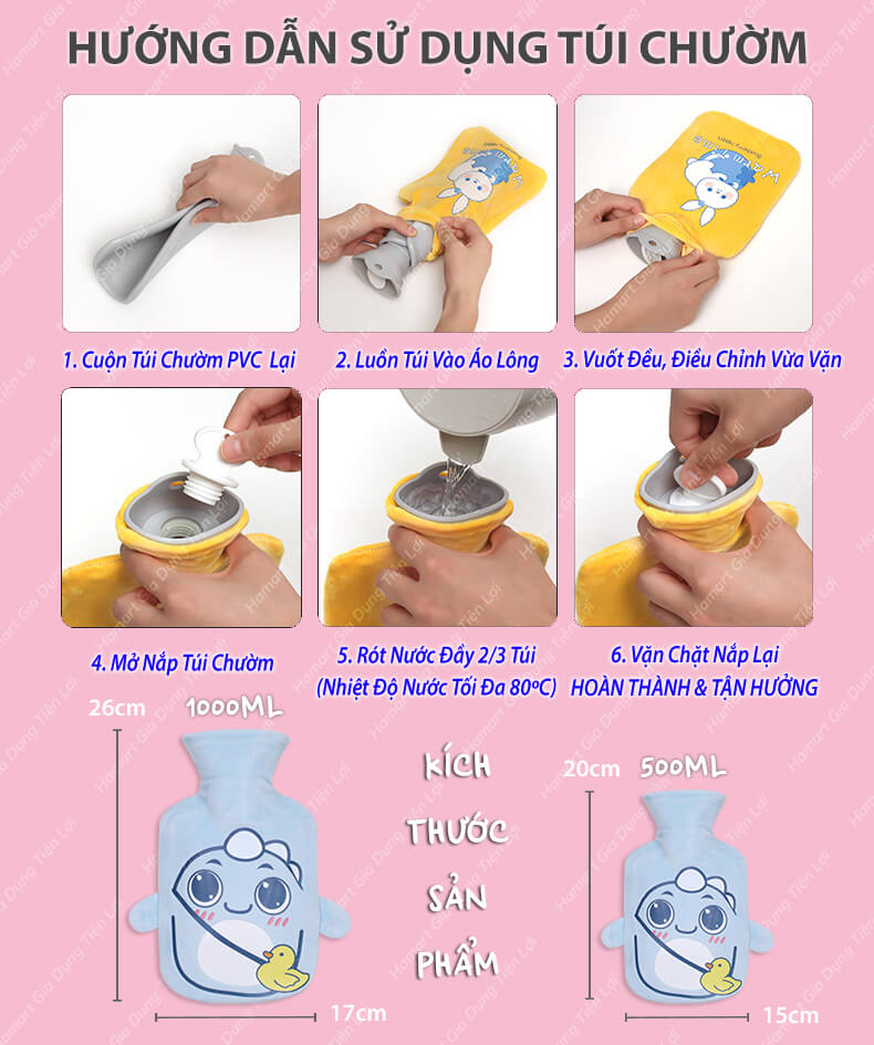- KHÔNG rót đầy nước vào túi vì nước nóng có độ giãn nở - Lượng nước rót vào phù hợp nhất là 350ml với túi nhỏ size 500m, 750ml nước với túi lớn 1000ml