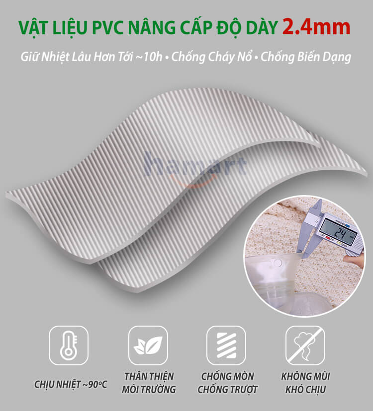 - Chất liệu PVC nâng cấp độ dày 2.4mm, chống cháy nổ, chống trượt, tăng thời gian giữ nhiệt