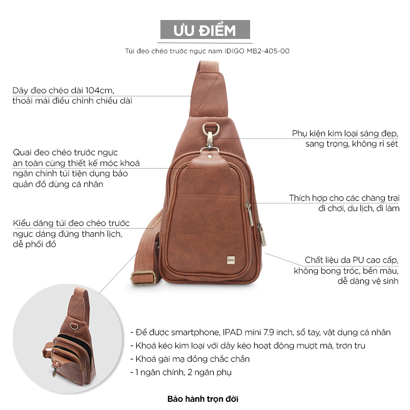 Với phom túi đứng cùng dáng túi đa dạng, thiết kế chi tiết móc khoá cùng ngăn ngoài mặt trước có khoá kéo ở miệng túi mang lại sự tiện lợi và an toàn cho người dùng, túi có quai đeo dài, gọn nhẹ lại rất hữu dụng với ngăn chứa rộng rãi ắt hẳn sẽ khiến cho các tín đồ yêu thời trang muốn sở hữu ngay lần gặp đầu tiên. Thấu hiểu được tâm tư của các chàng, IDIGO cho ra mắt sản phẩm Túi đeo chéo trước ngực nam IDIGO MB2-405-00.