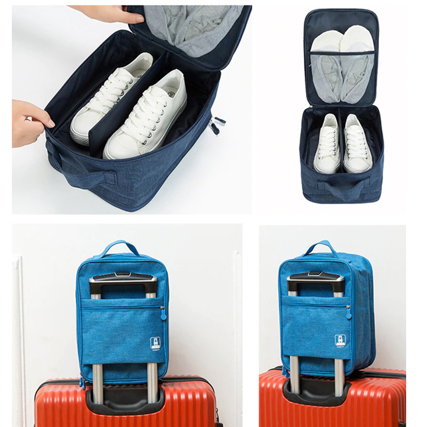 Trong mỗi chuyến đi du lịch hay công tác chắc chắn không thể thiếu những đôi giày. Tuy nhiên nếu để chúng vào trong túi ni lông hay bỏ vào vali sẽ khiến giày của bạn bị biến dạng, mất form dáng, ảnh hưởng đến chất lượng của món đồ, thay vào đó những chiếc túi đựng giày chuyên dụng đang là sự lựa chọn hàng đầu của rất nhiều người. Túi Đựng Giày Dép Du Lịch 3 Ngăn Chất Liệu Chống Thấm Nước, Túi Để Giày Thể Thao Đa Năng Có Móc Gài Tay Kéo Vali Tiện Lợi với kích thước nhỏ gọn nhưng lại có thể đựng được 3 đôi giày và rất nhiều món đồ tiện ích khác nhau. Đây chắc chắn là một vật dụng cần thiết trong set đồ đi du lịch của bạn.