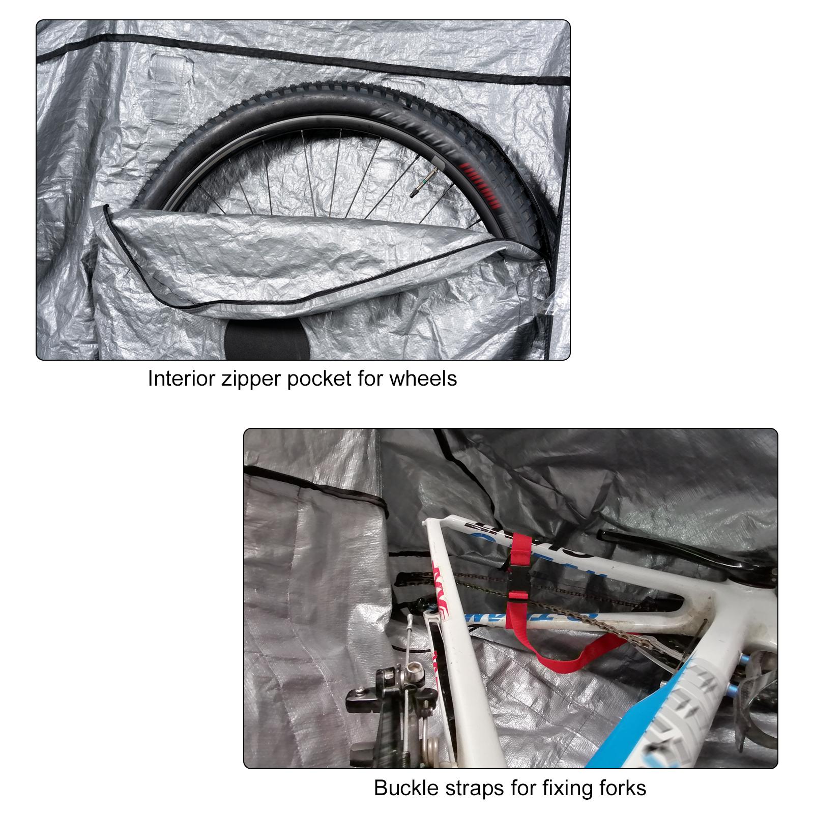 Features: Made from double-sided PE material, waterproof, dustproof and anti-scratch. Webbing reinforcement for enhanced durability. Interior zipper pockets designed for wheels; buckle straps for fixing bicycle forks. Enough space to fit for most bikes, suitable