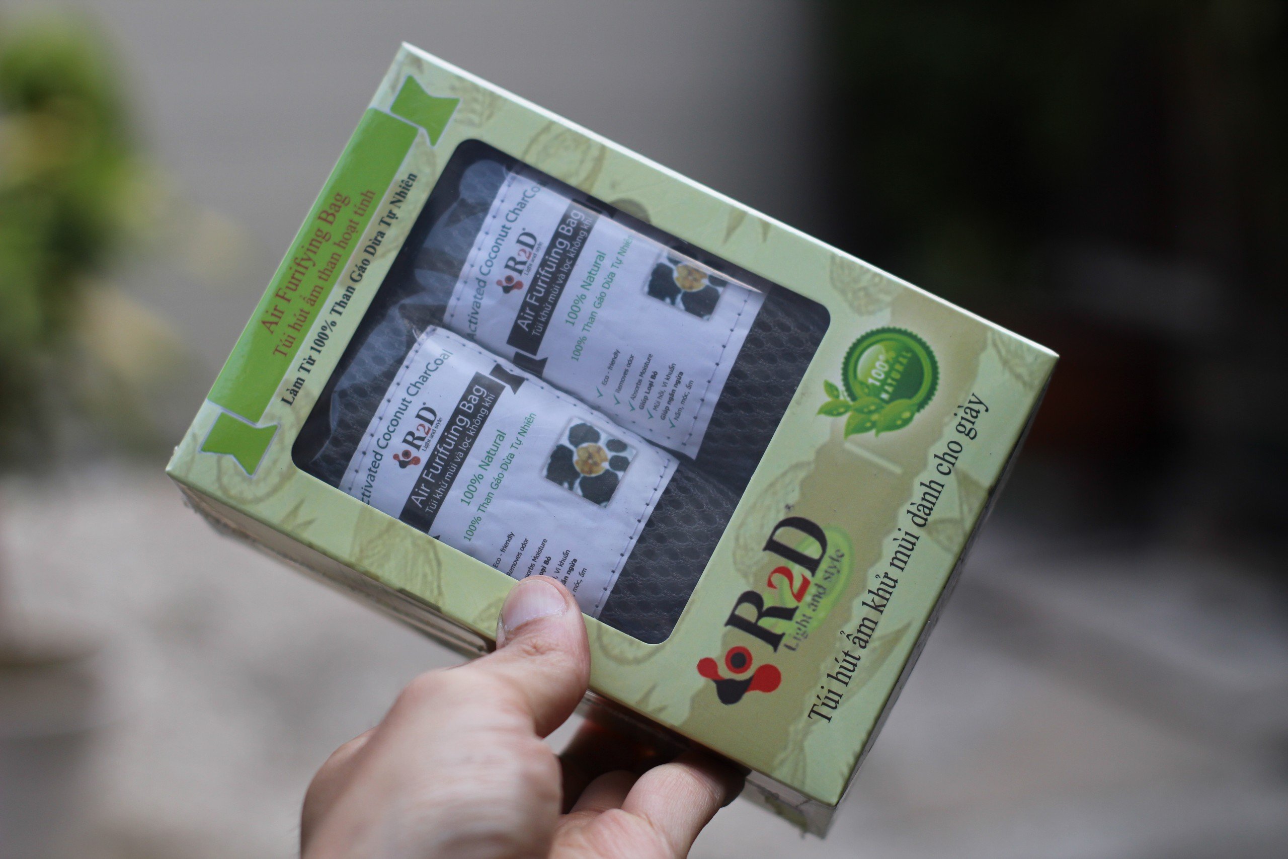 Trên tay hai túi than khử mùi giày của Hapaku, dùng ổn với mùi nhẹ, khả năng hút ẩm tốt hơn khử mùi