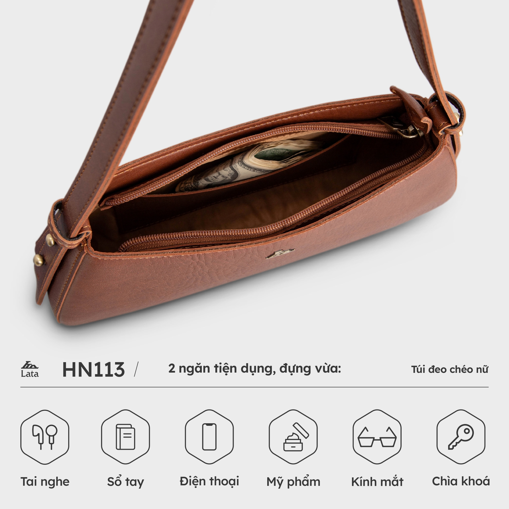 Túi đeo chéo da nữ hình thang Lata HN105 được làm từ chất liệu da tổng hợp cao cấp và hoàn thiện bằng các đường chỉ khâu tỉ mỉ. Ngăn túi rộng rãi để chứa