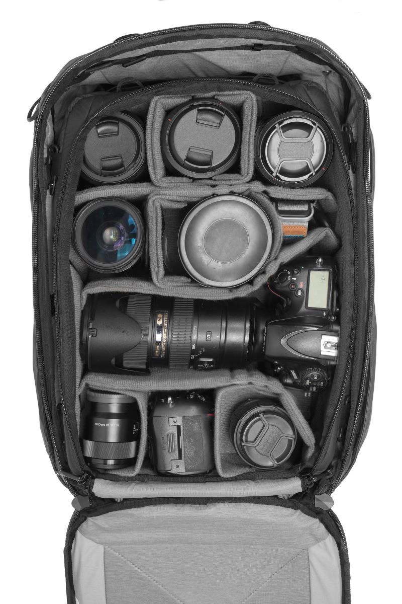 Quyền truy cập hoàn toàn vào bên trong của Travel Camera Cube được kích hoạt bởi bảng điều khiển phía sau có khóa kéo, trong khi hai lỗ bên có khóa kéo bổ sung cho túi Travel-Series cũng có các lỗ mở bên được đặt đối diện với người đeo khi túi được xoay từ mặt sau ra trước mặt hướng lên trên.