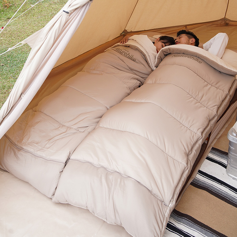 Túi ngủ đôi Cotton kèm Ggi NatureHike NH21MSD05 thích hợp với điều kiện 5-15°C, vải ngoài pongee chống thấm nước, mềm mại, giữ nhiệt tốt và êm ái. Với diện tích lên tới (185+30) x
