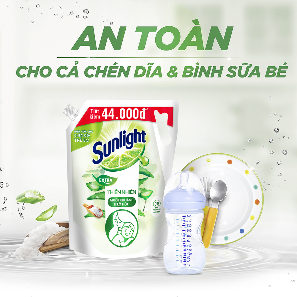 TINH CHẤT THIÊN NHIÊN SẠCH DỊU CHO CHÉN DĨA BÉ YÊU Mẹ có thể yên tâm rằng mọi món ăn tuyệt ngon và dinh dưỡng mà mẹ chuẩn bị cho bé với chén dĩa được làm sạch nhờ nước rửa chén Sunlight Thiên Nhiên muối khoáng và lô hội sẽ được bé "chén sạch" đó! Ưu điểm nổi bật:
