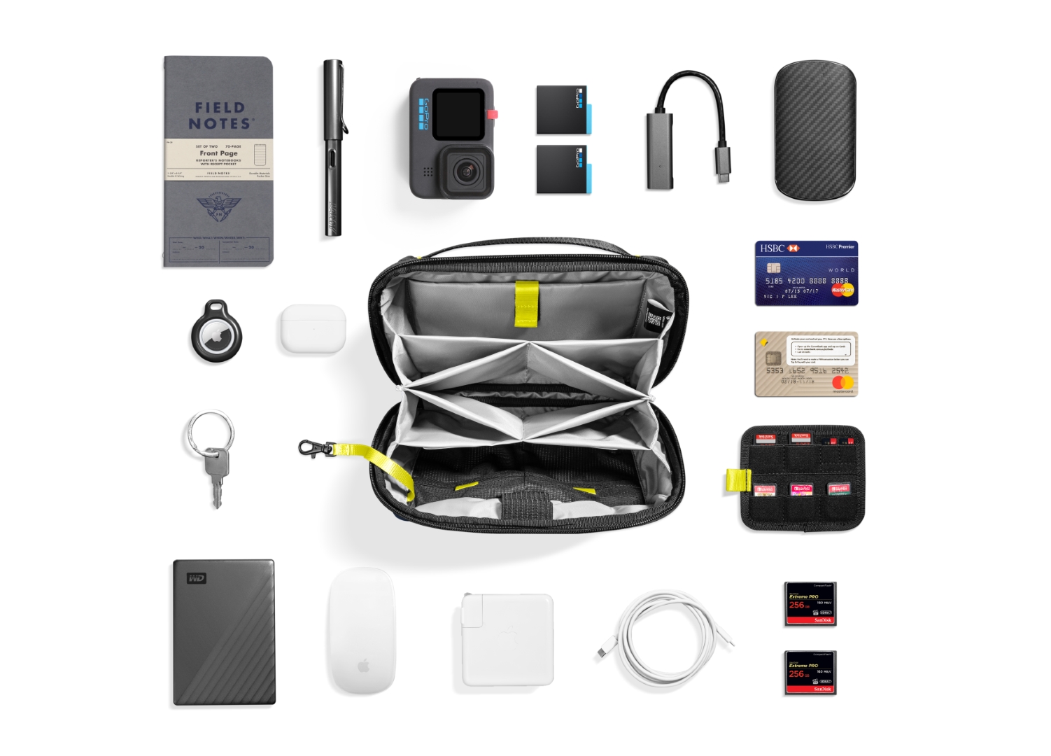 Túi đựng phụ kiện này có tổng cộng 13 ngăn để đựng cáp, đồ dùng hàng ngày hoặc vật dụng cần thiết khi đi du lịch, giúp đồ đạc của bạn được sắp xếp gọn gàng và dễ tìm. Một số vòng dây đeo phụ kiện không trơn bằng thun giữ cho các vật dụng như bút và pin luôn trong tầm tay. Một tấm ngăn có thể tháo rời với một số khe cắm thẻ cho thẻ SD, thiết bị chuyển đổi USB, v.v.