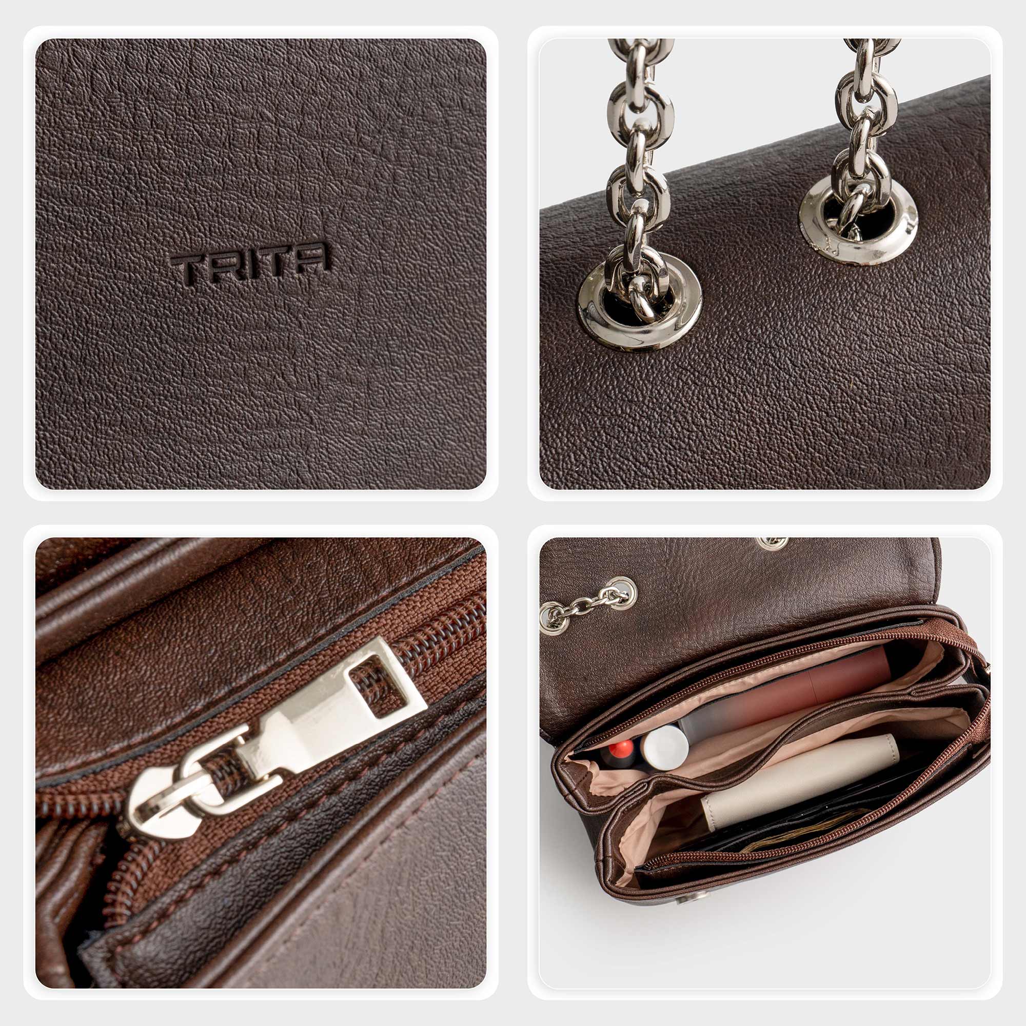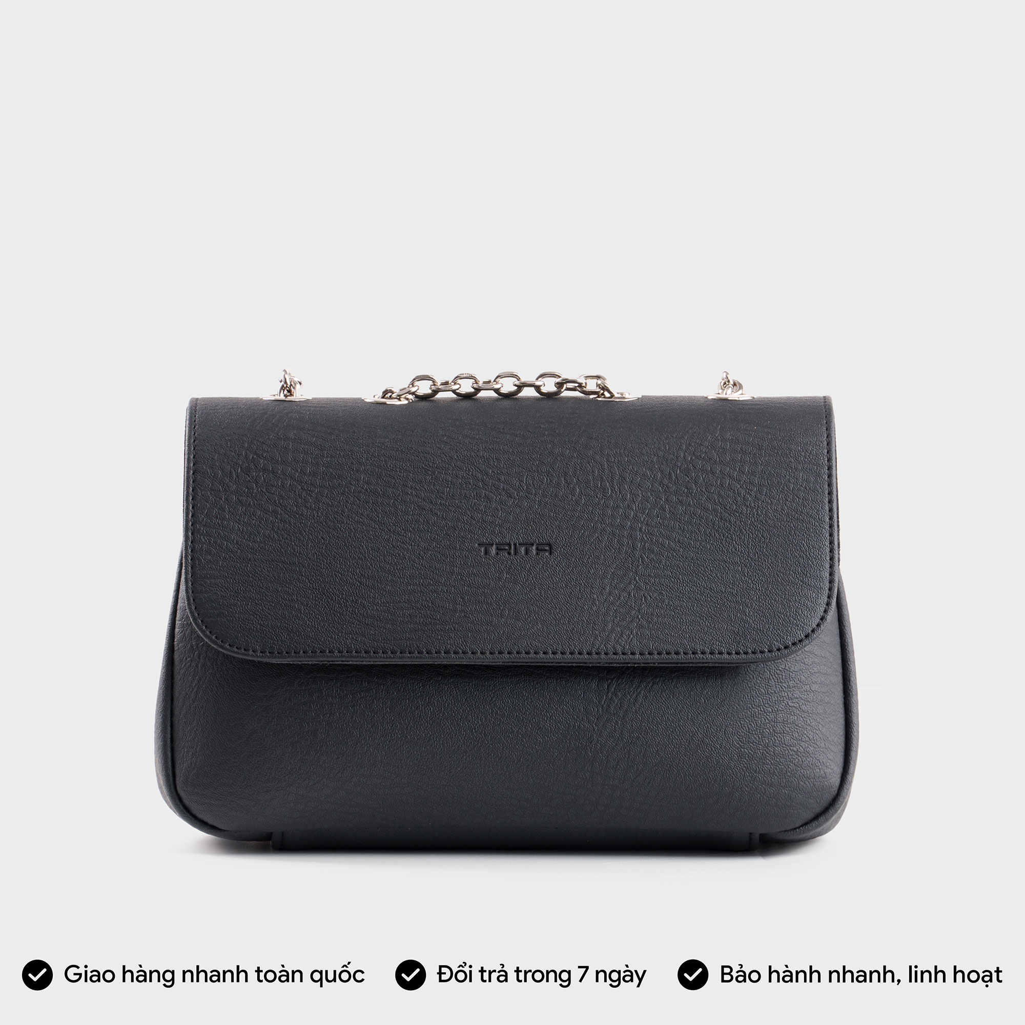 Túi xách da nữ nắp gập kèm dây phối xích hiện đại Trita RHN212 có kích thước cỡ trung rộng rãi, để thoải mái các vật dụng như ví tiền, điện thoại, sổ tay mini, bút viết,... Bên trong sản phẩm có 4 ngăn và được lót thêm 1 lớp vải dù giúp bảo vệ vật dụng tốt hơn. Bên ngoài sản phẩm được làm từ da tổng hợp cao cấp chống thấm nước, chống xước và cực kỳ bền. Ngoài ra, dây đeo sản phẩm có phối dây xích có thể điều chỉnh để đeo vai, đeo chéo không những tiện lợi mà còn rất hiện đại và sang trọng, phù hợp mang trong mọi hoàn cảnh.