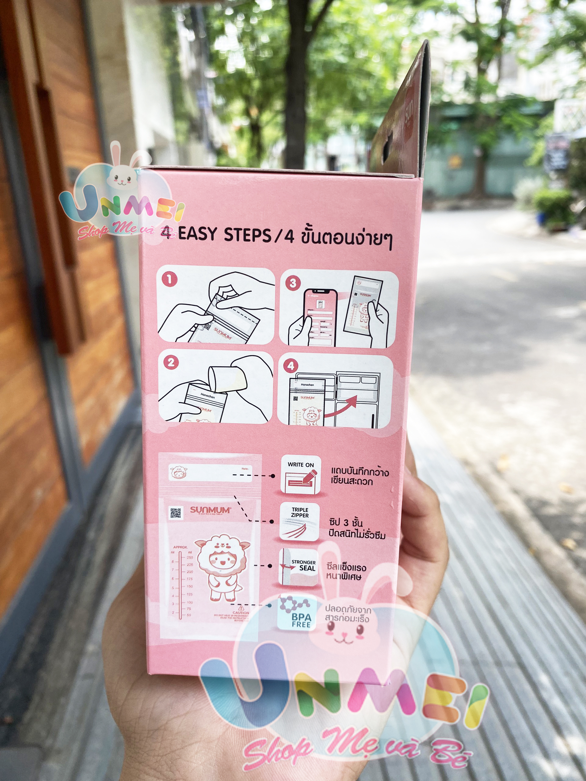 - Thương hiệu túi trữ sữa Sunmum đạt giải thưởng chất lượng ASEAN năm 2014. Hướng dẫn sử dụng: Xé mép để mở miệng túi, cho sữa vào, ép hết không khí và đóng chặt túi. Bảo quản túi sữa trong tủ lạnh hoặc tủ đông trong thời gian quy định. Cho sữa vào bình để sử dụng.