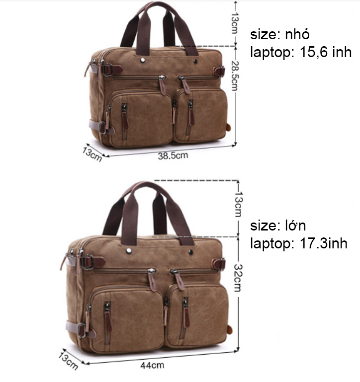 Kích thước size nhỏ: rộng 38.5cm ,cao 28.5cm,dày 13cm Kích thước size lớn: rộng 44cm ,cao 32cm,dày 13cm Phương pháp sản xuất: công nghệ cao Chất liệu : Vải Canvas cao cấp Chức năng: Không