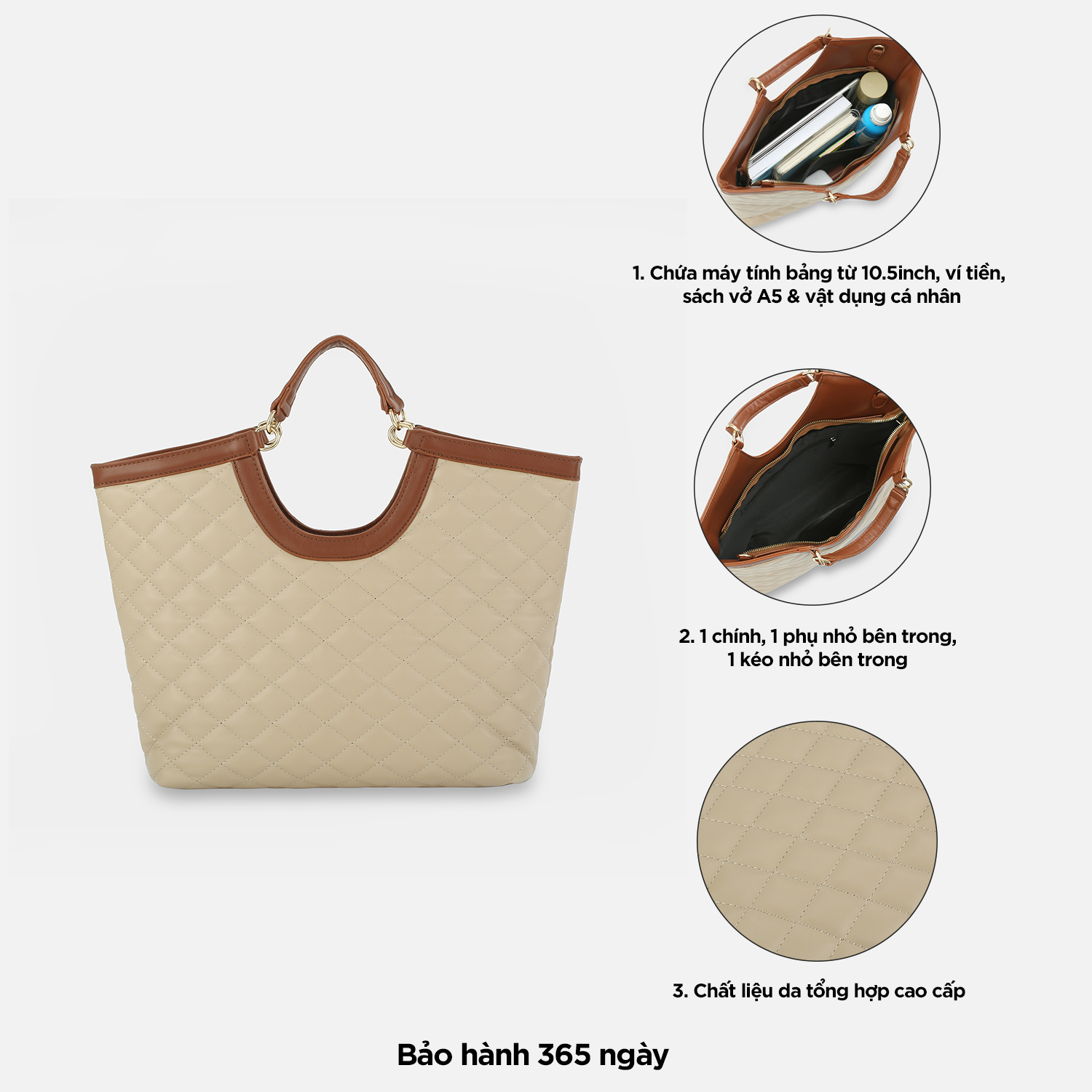 Chiếc Túi xách tay công sở, túi đeo chéo nữ chần trám dạo phố phong cách hàn quốc với thiết kế dáng hình thang cùng chi tiết chần trám lạ mắt tạo nên một phong cách vừa thanh lịch, lại rất hiện đại và tao nhã, ắt hẳn sẽ khiến cho các bạn siêu lòng ngay từ ánh nhìn đầu tiên. Túi xách tay công sở, túi đeo chéo nữ chần trám dạo phố phong cách hàn quốc này thích hợp cho cho các bạn mang đi làm, đi chơi, du lịch hay dạo phố, cà phê cùng bạn bè... - Kích thước: 29 x 7.5 x 27.5 x 40cm (Dài đáy x Rộng x Cao x Dài miệng) - Kích thước chiều cao có thể kéo khoá: 18cm - Màu sắc: Đen, Be, Kem, Nâu đậm - Chất liệu: Da tổng hợp - Trọng lượng: 460 gram - Xuất xứ: Trung Quốc - Số ngăn: 1 chính, 1 phụ nhỏ bên trong, 1 kéo nhỏ bên trong - Chiều cao quai xách tay: 14cm - Chiều dài dây đeo chéo: 110cm (có khoá thâu tăng giảm độ dài) - Cách đeo: (1) đeo chéo (2) đeo vai (3) xách tay Gam màu thanh lịch, bền màu với thời gian, đường may chắc chắn. Chất liệu da tổng hợp có độ mềm vừa đủ tạo nên phom dáng túi, vừa có độ đàn hồi, vừa chống thấm nước nhẹ, bền đẹp và dễ dàng vệ sinh. Phom túi hình thang với chất liệu da có độ mềm vừa phải giúp túi hạn chế bị cong vênh, nhăn gãy khi sử dụng. Bên trong túi có 1 ngăn chính thích hợp đựng máy tính bảng từ 10.5inch trở xuống, điện thoại, ví tiền (Có thể để tài liệu A4 trong trường hợp không kéo khoá)… Ngoài ra bên trong túi còn có 1 ngăn phụ nhỏ đựng các loại giấy tờ tuỳ thân, thẻ xe cùng 1 ngăn kéo nhỏ để được chìa khoá, mỹ phẩm… rất thích hợp sử dụng để đi làm, đi chơi, du lịch hay dạo phố. Túi có khóa kéo cao cấp hoạt động mượt mà và trơn tru, dây kéo bền & chắc chắn. Đặc biệt, luân phiên xách tay với quai xách cố định cao 14cm hoặc đeo chéo/đeo vai với dây da dài 110cm giúp thay đổi phong cách. Sản phẩm túi xách này được IDIGO đặt sản xuất tại nhà máy Trung Quốc và nhập khẩu chính ngạch về Việt Nam, có thông tin sản phẩm nhập khẩu in rõ ràng trên tem nhãn.
