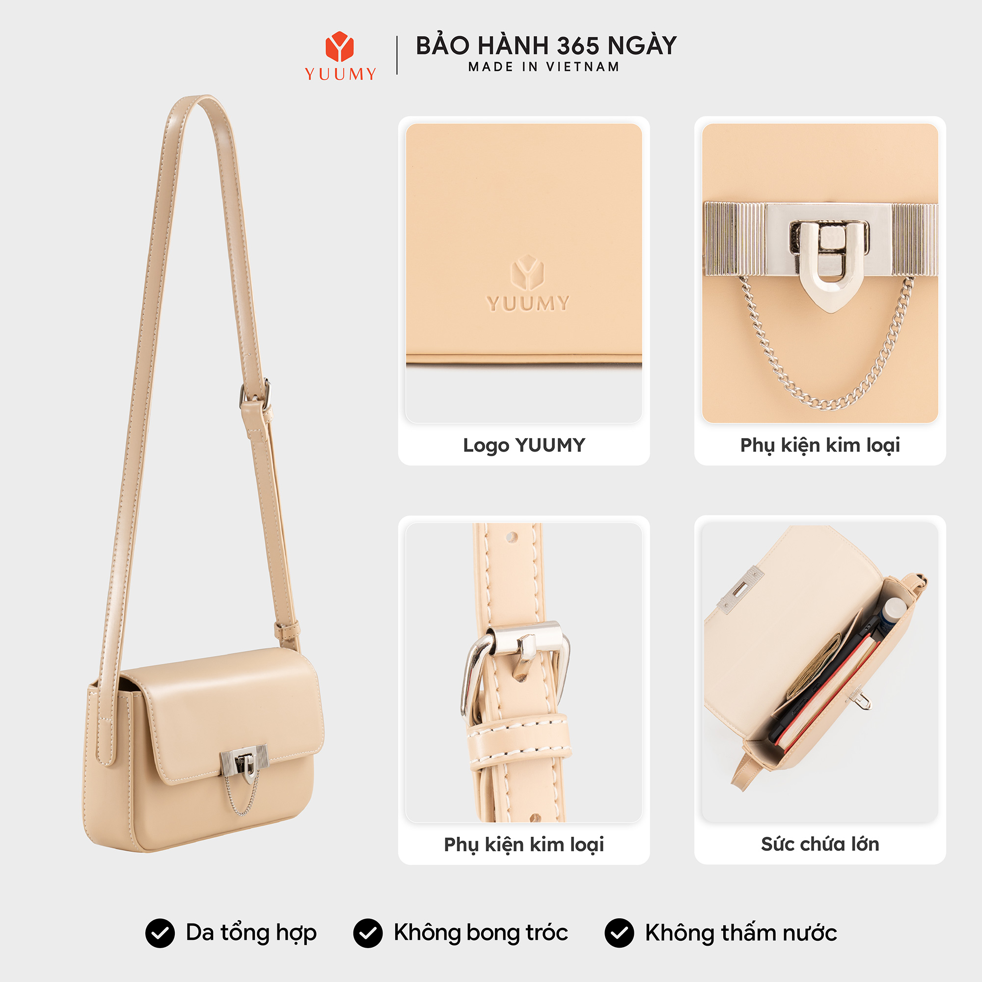 Túi xách vai Yuumy YTX76 với thiết kế dáng vòm mềm mại, form đứng vững vàng cùng gam màu dịu nhẹ, chiếc túi này dễ dàng đồng hành cùng bạn trong nhiều hoàn cảnh –