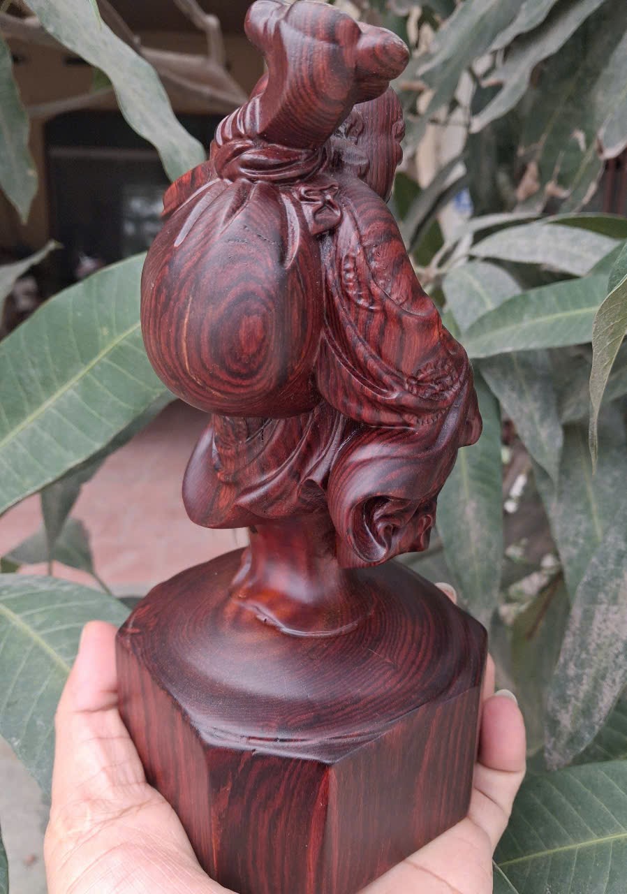 _ Tượng phật di lặc gánh cành đào được làm bằng chất liệu gỗ huyết long liền khối tự nhiên 100% _ Kt cao 20×9×6cm _ Tượng được chạm khắc gọt tỉa vô cùng tỉ
