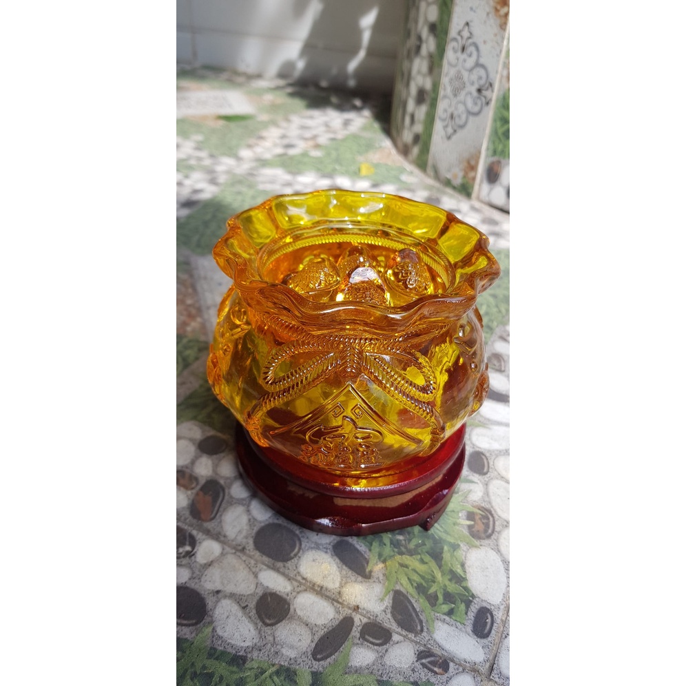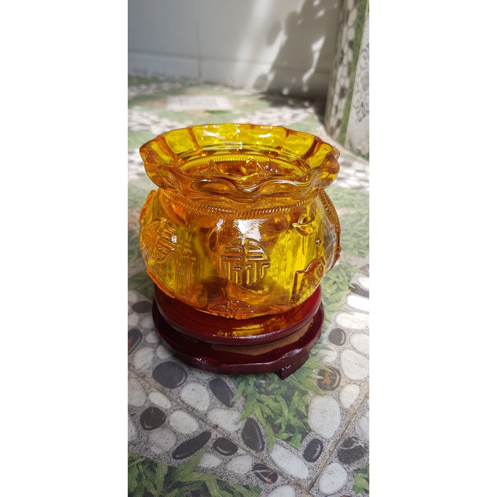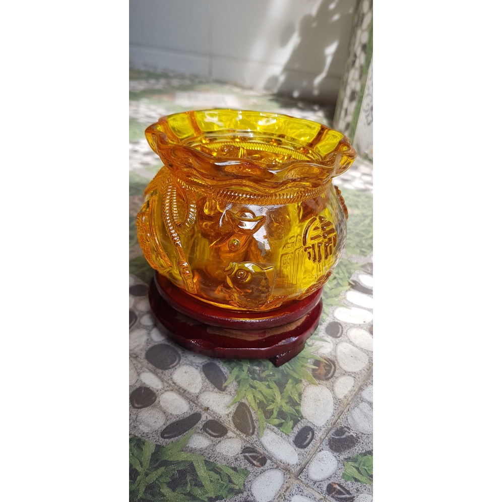 Thố tụ tài to mới miệng kiểu màu vàng anh tài lộc 20 thỏi xiền vàng đá lưu ly tự nhiên đế gỗ Size lớn đk 13cm x Cao 13cm cả đế x thố cao 9cm