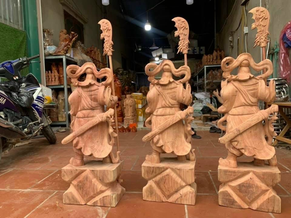 Tượng quan công cầm đao đứng trên đầu hổ phù được làm bằng chất liệu gỗ hương đá tự nhiên 100% Kích thước cao 80ngang31 sâu 21cm _ Tượng quan công cầm đao được trạm khắc tỉ mỉ tinh sảo kỳ công .Đi hầu hết mọi chi tiết góc ngách nội dung hoa văn của quân công đều được chỉnh sửa ngọt tỉa hoàn toàn bằng tay thủ công .Đồng thời tượng quan công được kiểm định rất kỹ lưỡng như cho vào thẩm sấy cho gỗ khô kiệt .Mục đich trống dập nứt vênh mo mối mọt .Kết hợp với trà nhám đánh giấy giáp nhiều lần cho sạch sẽ ,Sờ mát lạnh song cho vào phun lót làm bóng mờ để giữ lại mầu sắc vân gỗ tự nhiên .Tượng quan công được làm và hoàn thiện do bàn tay khối óc tài hoa .Từ những người thợ giàu kinh nghiệm cũng như tay nghề cao trong làng nghề truyền thống .Chính vì thế tượng quan công đã đáp ứng đầy đủ những tiêu trí ( Đẹp bền rẻ ) Thẩm mỹ nghệ thuật với chất lượng tuyệt vời