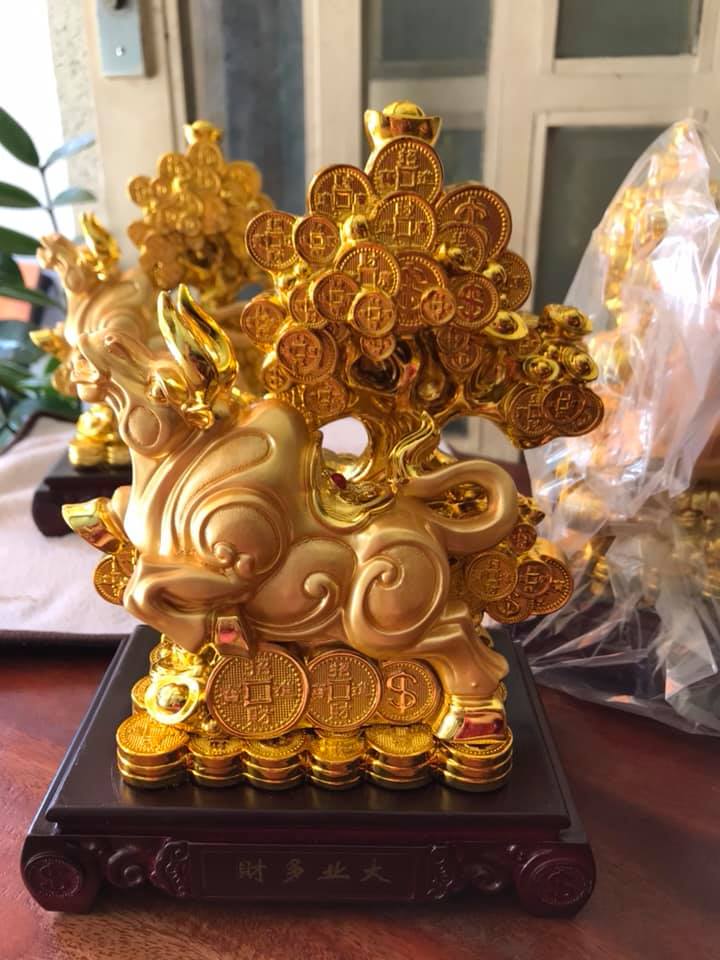 Tượng Trâu Vàng Mới Đứng khối tiền Cây tài lộc Màu Vàng đặt bàn làm việc may mắn ạ Size cao 20cm x ngang 15cm x sâu 10cm Anh chị trưng con trâu vàng trên