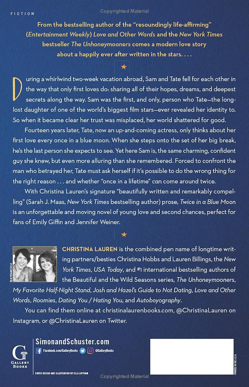 With Christina Lauren’s signature “beautifully written and remarkably compelling” (Sarah J. Maas, New York Times bestselling author) prose and perfect for fans of Emily Giffin and Jennifer Weiner, Twice in a Blue Moon is an unforgettable and moving novel of young love and second chances.