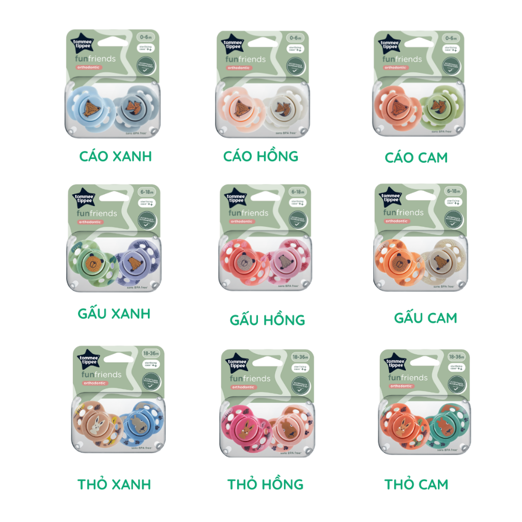 Ty Ngậm Vui Nhộn Cho Bé Tommee Tippee Fun-Friends 0-6, 6-18, 18-36 Tháng (Vỉ Đôi)    Thương hiệu: Tommee Tippee – Anh Quốc   Ty ngậm là một trong những phụ kiện sơ sinh được sử dụng phổ biến ở phương Tây, gắn liền với việc chăm sóc và nuôi dạy con một cách hiện đại và tân tiến. Thời gian gần đây, các bậc cha mẹ tại Việt Nam đã học hỏi, tìm hiểu và cũng lựa chọn cho con mình những sản phẩm ty ngậm chất lượng đến từ các thương hiệu cao cấp và uy tín. Chiếc ty ngậm thường được làm từ chất liệu silicon mềm dẻo, có độ co giãn và đàn hồi giống như ty mẹ. Sản phẩm giúp bé tăng cảm giác cho cơ hàm, nhưng không bị bé cắn đứt trong quá trình sử dụng. Theo đó chiếc ty ngậm giả giúp bé giảm thiểu hiện tượng quấy khóc trong quá trình cai sữa.  Thương hiệu số 1 đến từ Anh Quốc Tommee Tippee đã phát triển bộ sưu tập ty ngậm mà các bé rất yêu thích. Các sản phẩm ty ngậm Tommee Tippee luôn đi kèm hộp đựng để giữ vệ sinh khi không sử dụng.     Ty ngậm là vật dụng yêu thích được và cực kỳ hữu dụng trong trường hợp bé quấy khóc, giúp bé bình tĩnh lại và đặc biệt là ngủ ngon hơn. Đây là một trong những lý do mà bố mẹ tìm đến sự hỗ trợ của chiếc ty ngậm.     Bên cạnh đó, ty ngậm hỗ trợ giúp bé chấm dứt thói quen mút tay và tuyệt đối đảm bảo vệ sinh, an toàn cho sức khỏe, giúp bé con đường phát triển trí não và thể chất một cách đầy đủ.   Đây là phiên bản Ty ngậm Fun-Friends mới nhất của Tommee Tippee. Với phiên bản này, sản phẩm sẽ không còn có nắp nhựa riêng cho từng ty ngậm mà chỉ có hộp vỏ chung cho hai ty ngậm vỉ đôi. Sự điều chỉnh này dựa theo chính sách hạn chế rác thải nhựa, bảo vệ môi trường của tập đoàn Mayborn.   Đặc điểm nổi bật của ty ngậm Fun-Friend Tommee Tippee: - Ty ngậm chỉnh nha: Phần núm ty ngậm được thiết kế cân xứng để tăng tính cân bằng, hỗ trợ sự phát triển khoang miệng tự nhiên của bé. Bên cạnh đó, núm ty ngậm cân xứng giúp bé ngậm dễ dàng và không bị tuột khỏi miệng. Bé có thể tự điều chỉnh ty ngậm trong miệng một  cách thoải mái, theo bất kỳ vị trí nào trong miệng, tránh trường hợp núm ty có thể bị đặt ngược vị trí trong miệng khi bé sử dụng núm ty không cân xứng.   Ty ngậm Fun-Friends Tommee Tippee được thiết kế cân xứng, chỉnh nha   - Giúp bé cảm thấy dễ chịu: Ty ngậm Tommee Tippee có các lỗ hổng ở 2 bên vành khiên, thông thoáng, không làm cho bé có cảm giác hầm, khó chịu và phát sinh dị ứng trên vùng quanh miệng của bé.   Ty ngậm Fun-Friends là vật dụng yêu thích, không thể thiếu của bé - Bé dễ dàng chấp nhận: Ty ngậm cho bé là một sản phẩm được đánh giá là nên có trong giai đoạn phát triển của bé từ sơ sinh đến 3 tuổi. Mỗi độ tuổi, giai đoạn phát triển của bé sẽ phù hợp với từng kích cỡ và công năng của ty ngậm. Ty ngậm dành cho trẻ sơ sinh sẽ khác hơn các loại ty ngậm dành cho trẻ đang trong giai đoạn mọc răng, thích nhai vì ngứa nướu, và cũng khác với ty ngậm dành cho trẻ đã phát triển răng, mọc răng. Chính vì vậy bạn cần phải xem xét kỹ lưỡng trước khi chọn mua ty ngậm cho bé, lựa chọn đúng loại ty ngậm phù hợp, mang lại nhiều lợi ích, tốt cho sự phát triển răng miệng của bé. Ty ngậm Tommee Tippee Fun-Friends có hình dáng cân xứng tạo cho bé cảm giác thân quen hơn và bé dễ dàng chấp nhận ngay từ lần đầu tiên.   Ty ngậm Fun-Friends Tommee Tippee cực kỳ an toàn, cao cấp   - Đặc điểm nổi bật - thoáng khí: Được thiết kế cho cuộc sống thực tế, ty ngậm Tommee Tippee Fun-Friends đặc biệt chú trọng vào chức năng thoáng khí phục vụ các “thượng đế nhí” của mình.    Ngoài những lúc quấy khóc do thiếu hơi mẹ hay khi bé đi ra ngoài, hay đến một môi trường lạ, thì chiếc ty ngậm phù hợp sử dụng cho những trẻ đang trong giai đoạn mọc răng có cảm giác ngứa ngáy ở vùng nướu. Lúc này mẹ cho bé dùng ty ngậm, bé sẽ có ngay “vật thế thân” để trút cơn giận bằng cách cử động nhai cơ hàm. Khi đó, bé cảm thấy dễ chịu hơn và không còn quấy khóc nữa.