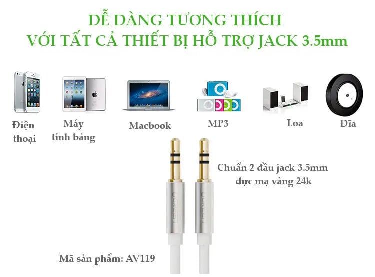 - Cáp Chuyển Đổi Ugreen 3.5mm Sang 2 RCA 10511 (1.5m) được dùng để kết nối từ điện thoại, máy tính, máy nghe nhạc… đến các thiết bị âm thanh có chuẩn RCA (hoa sen)