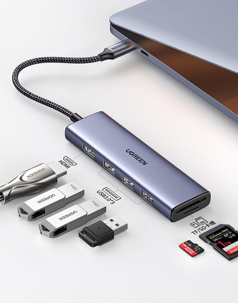 1. Hub đa năng 6 trong 1 Ugreen 80129 giúp bạn mở rộng từ 1 cổng USB Type C sang các cổng khác như HDMI, USB 3.0, khe đọc thẻ nhớ. Giúp bạn kết nối