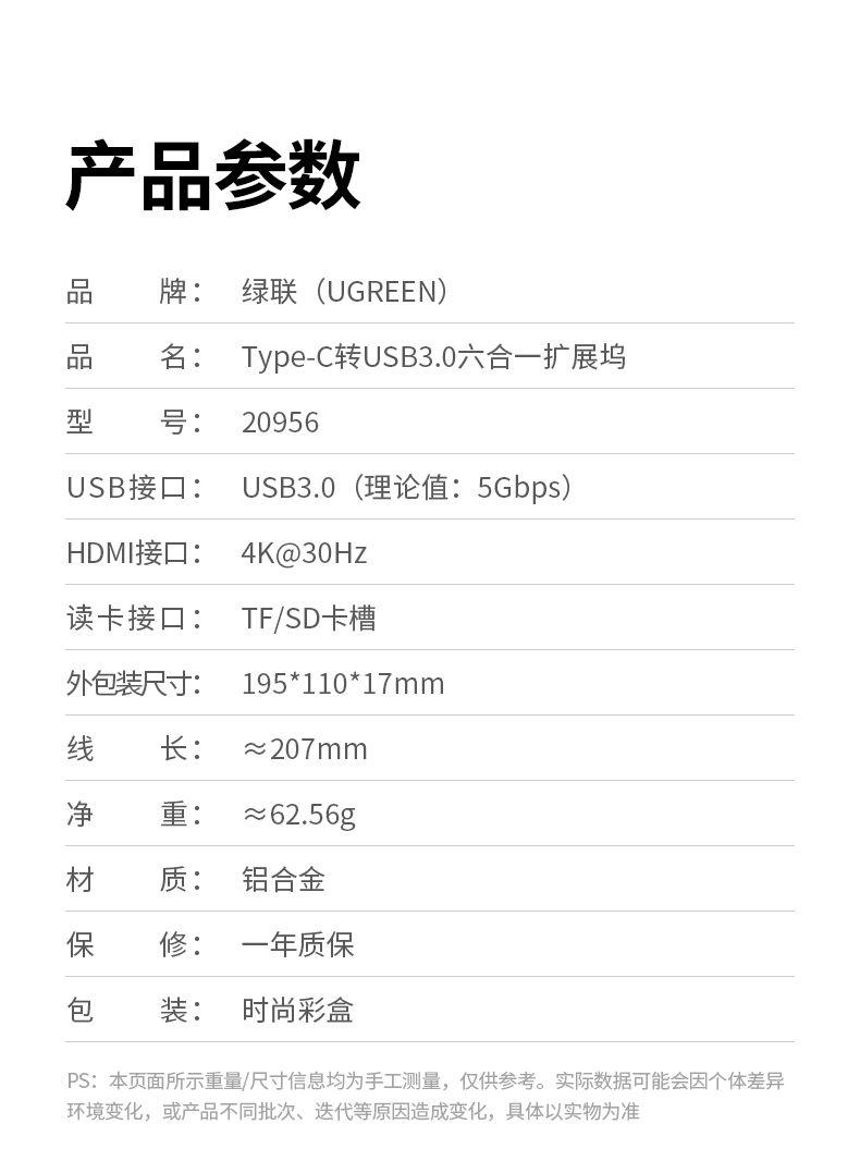 1. Input USB-C 2. Output 2 x USB 3.0, 1 x USB-C, 1 x 4K HDM Port, 1 x SD Card Slot, 1 x TF Card Slot 3. Dimension 115mm x 36mm x 12.5mm 4.