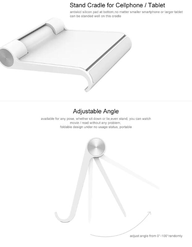 1. Color : Gray 2. Compatible Device : Phone 3. Display Size : 4.7 to 7.9 inch 4. Usage : Desk 5. Material : Aluminum Alloy 6. 25 x 12 x 4 cm 7. 248g
