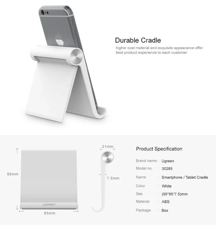 Ugreen 30485 White Multi Angle Adjustable Portable Stand Lp115 1. Color : White 2. Compatible : All cellphone / Tablets 3. Material : ABS + Silicone Pad 4. Package : Ugreen Retail box 5. 200