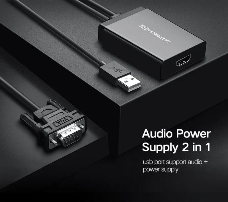 - Bộ Chuyển Đổi Ugreen HDMI Sang VGA Audio Cáp Tròn Có Nguồn Phụ 40253 giúp kết nối máy tính xách tay, Macbook, Chromebook, Rasberry Pi với giao diện HDMI để chiếu, hiển thị, màn hình