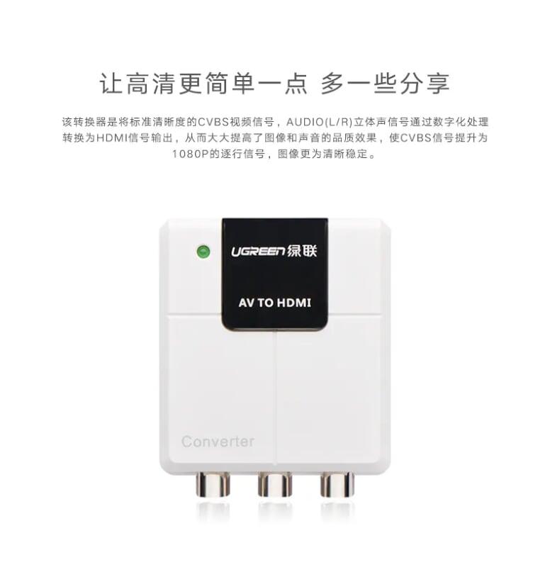 Ugreen 40225 Av To Hdmi Converter TrắNg 40225 1. Features: Convert from standard AV and FL / FR stereo audio signals to HDMI signals. 2. Support PAL, NTSC3.58, NTSC4.43, SECAM, PAL / M, PAL /