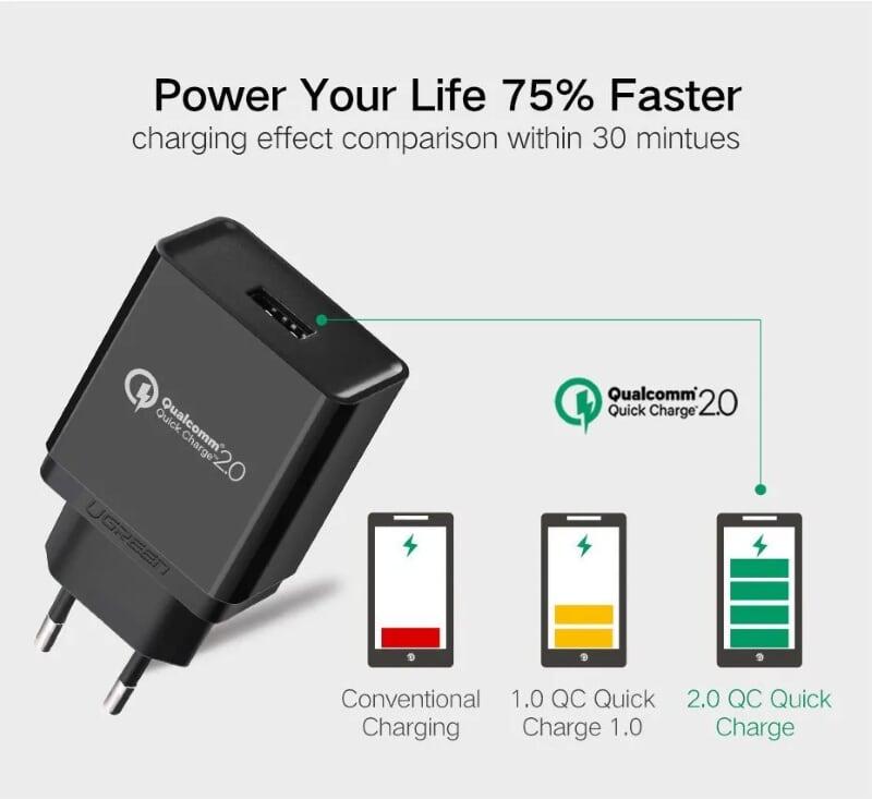 Củ sạc nhanh UGREEN CD122 – Sạc nhanh QC 3.0 18W kèm cổng nối đất