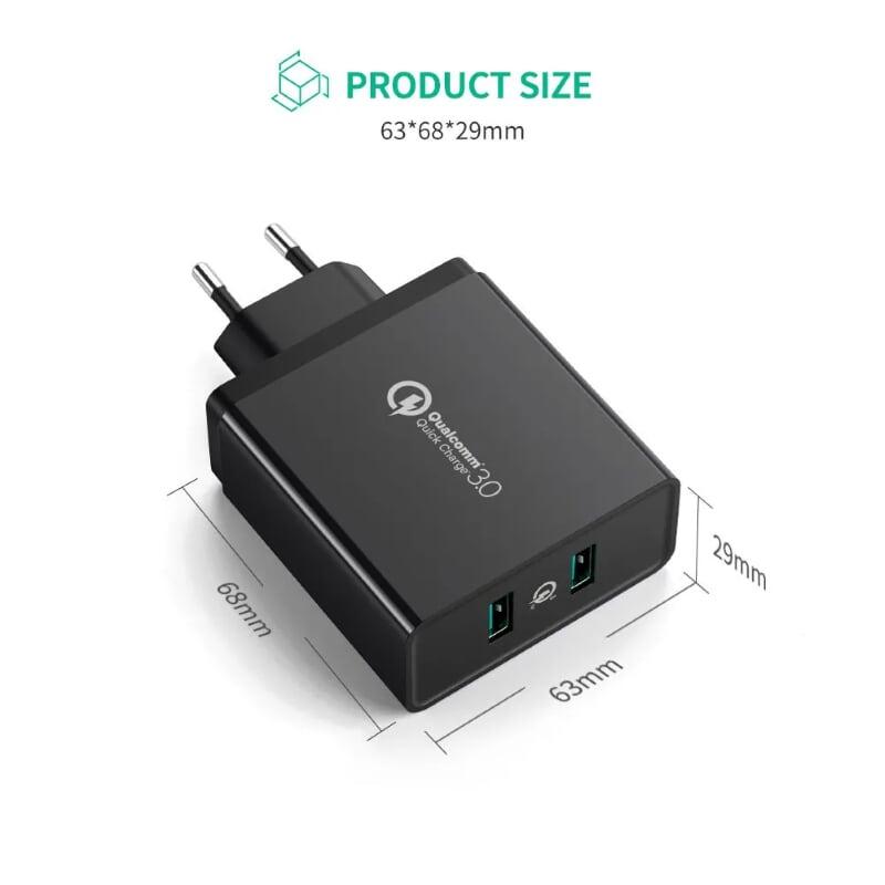 1. input: 100-240V ~ 50 / 60Hz 1.2A 2. Max 2xQuick Charge 3.0 Output: 5V / 3A 9V / 2A 12V / 1.5A 3. Output total power: 36W Max 4. Color: Black 5. 150g 6.