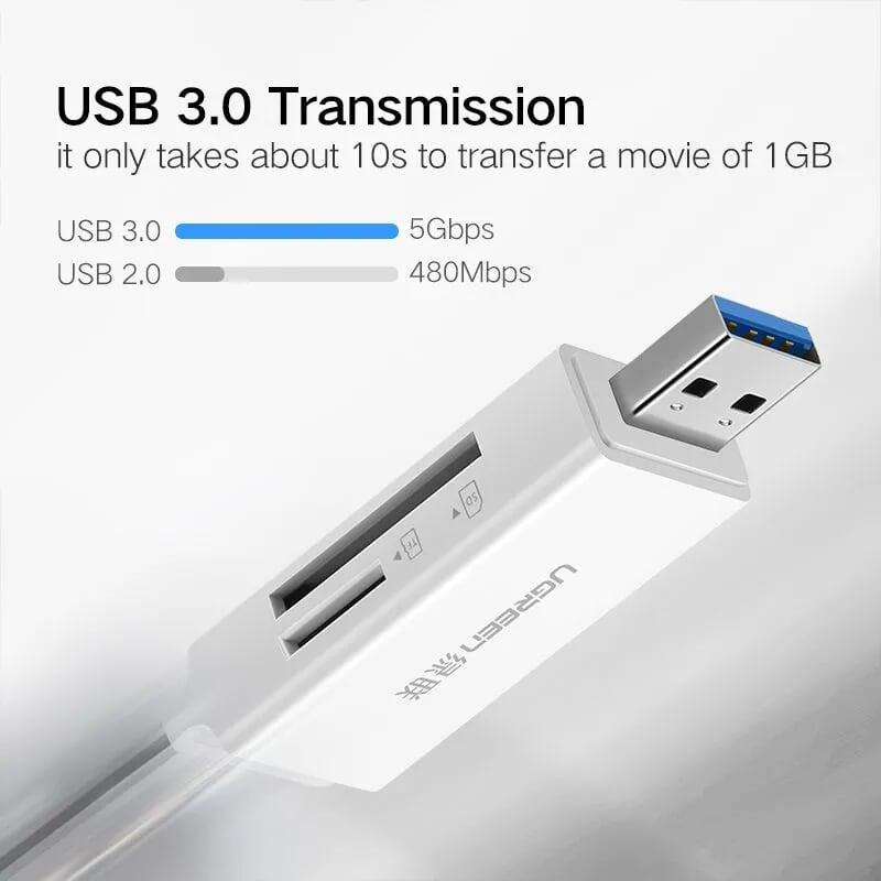 Ugreen 40753 usb 3.0 to tf + sd card readerdual card dual read white cm104 1. Input : USB 3.0 A Male 2. USB 3.0 and compatible with USB2.0 speeds up to 5Gbps 3. Output