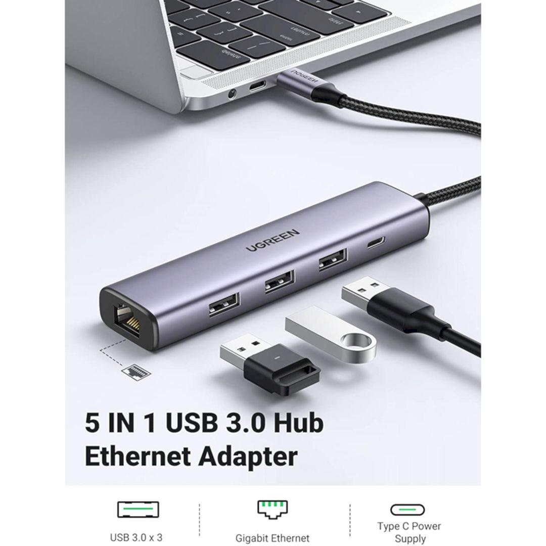 Hub chuyển đổi 5 in 1 USB Type-A ra Lan 1000Mbps Kèm HUB 3 Cổng USB 3.0 Ugreen 60554 cao cấp
