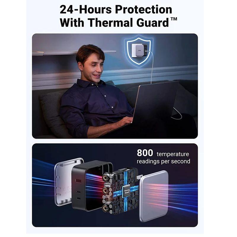 1. Power 140W 2. 3 USB ports (USB-C x 2, USB-A x 1) 3. When using 3 ports at the same time, it supports maximum power of 65W, 45W and 22.5W from each port. 4.