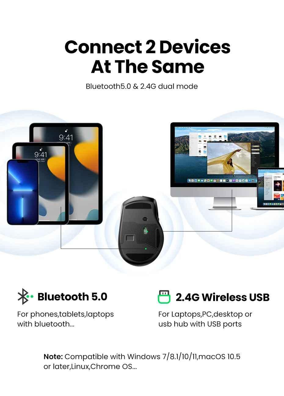 1. Brand: Ugreen 2. Product name: Wireless mouse + Bluetooth 3. Model: 90855 - MU006 4. Color : Black 5. Connection method: 2.4G wireless (USB receiver) + Bluetooth 5.0 6. Working distance: 15 meters 7.