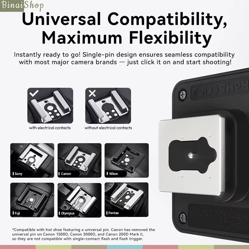 - Đế gắn hotshoe tiêu chuẩn có chân cắm đa năng tiếp xúc tốt với nhiều loại máy ảnh DSLR như S.ony, C.anon, N.ikon, F.ujifilm,P.anasonic, O.lympus.