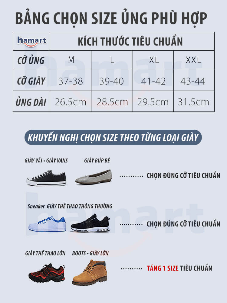 Lưu ý: Chọn size tiêu chuẩn như trên nếu là giày dép thông thường. Nếu Quý Khách đi giày thể thao cỡ lớn như giày bóng rổ hoặc bốt lớn, giày vải bố ... thì chọn tăng 1 size nha.