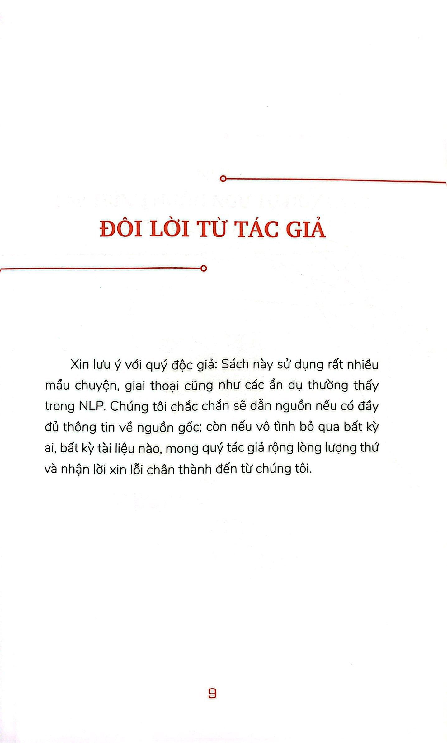 Ứng Dụng Tâm Lý Học NLP - Thay Cách Nghĩ Mở Lối Đi Sử dụng những kỹ năng NLP hiệu quả để tái định hình con đường dẫn đến thành công. Lập trình ngôn ngữ tư duy (NLP) bao gồm rất nhiều kỹ thuật tâm lý giúp bạn “tái lập” não bộ của m.ình – thay thế thái độ tiêu cực cản trở bản thân bằng lối tư duy tích cực, thúc đẩy bạn tự tin hơn, hiệu quả hơn và thành công hơn. Trong 20 bước đơn giản, Neil Shah sẽ hướng dẫn bạn cách sử dụng NLP để phát triển những thói quen hành động và tư duy mới nhằm giúp bạn thành công ở mọi mặt trong cuộc sống, từ việc tác động người khác, nắm được cách họ ảnh hưởng đến m.ình, quản lý căng thẳng cho đến việc vươn tới mục tiêu của bản thân.